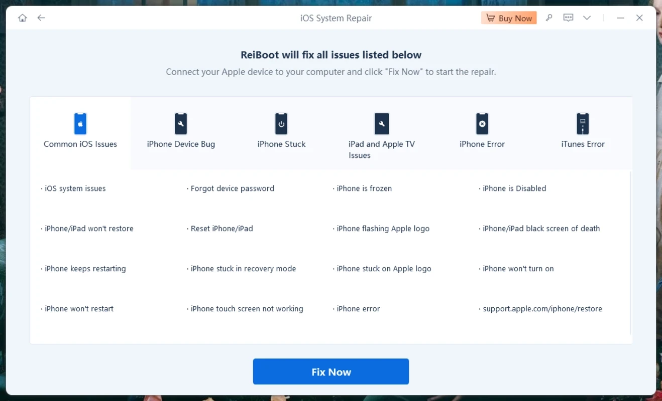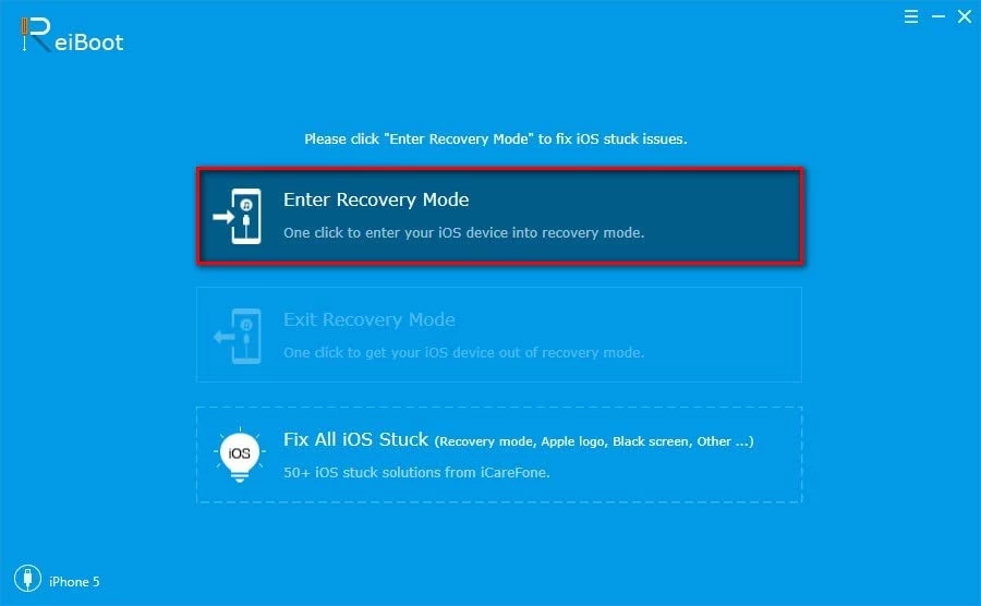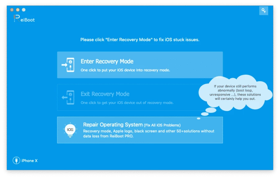 Tenorshare ReiBoot — это бесплатная сторонняя утилита для исправления распространённых ошибок iPhone , iPad Touch и других устройств iOS. Одним щелчком мыши этот инструмент для исправления циклической загрузки выводит iPhone из режима восстановления, а также позволяет ему перейти в режим восстановления, устраняет зависание на логотипе Apple, чёрный экран, синий экран, циклическую загрузку и многие другие проблемы, которые можно решить с помощью Tenorshare ReiBoot.
